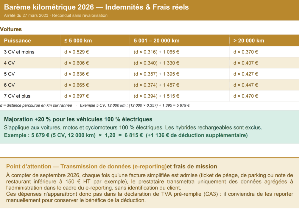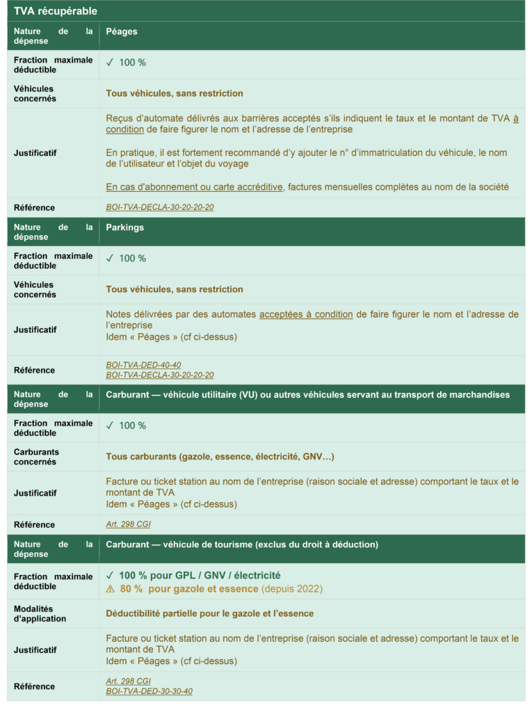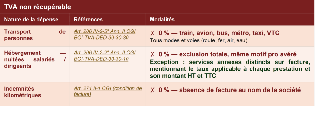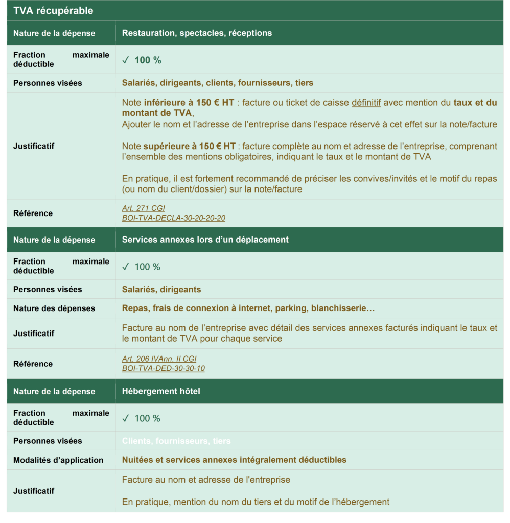 | Rappel : 4 conditions générales cumulatives pour la déduction de la TVA, y compris pour les frais de mission— Art. 271 II 1 CGI, art. 206, IV et 242 nonies A I Ann. II CGI 1. Dépense affectée à des opérations imposables ouvrant droit à déduction 2. Usage privé inférieur à 90 % pour les salariés ou dirigeants 3. Facture originale au nom de l’entreprise avec toutes les mentions légales (sauf tolérances mentionnées ci-dessous) 4. Règlement intégral justifié (paiement direct ou remboursement du salarié) |